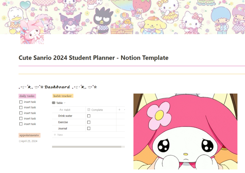This cute Sanrio Notion template is perfect for students, busy bees, and the Type A folx who enjoy having everything in one place. Duplicate this into your existing Notion workspace (which you can get for free if you don't have one already) and use it to organize your daily and weekly tasks, take class notes, manage goals, set reminders, etc.