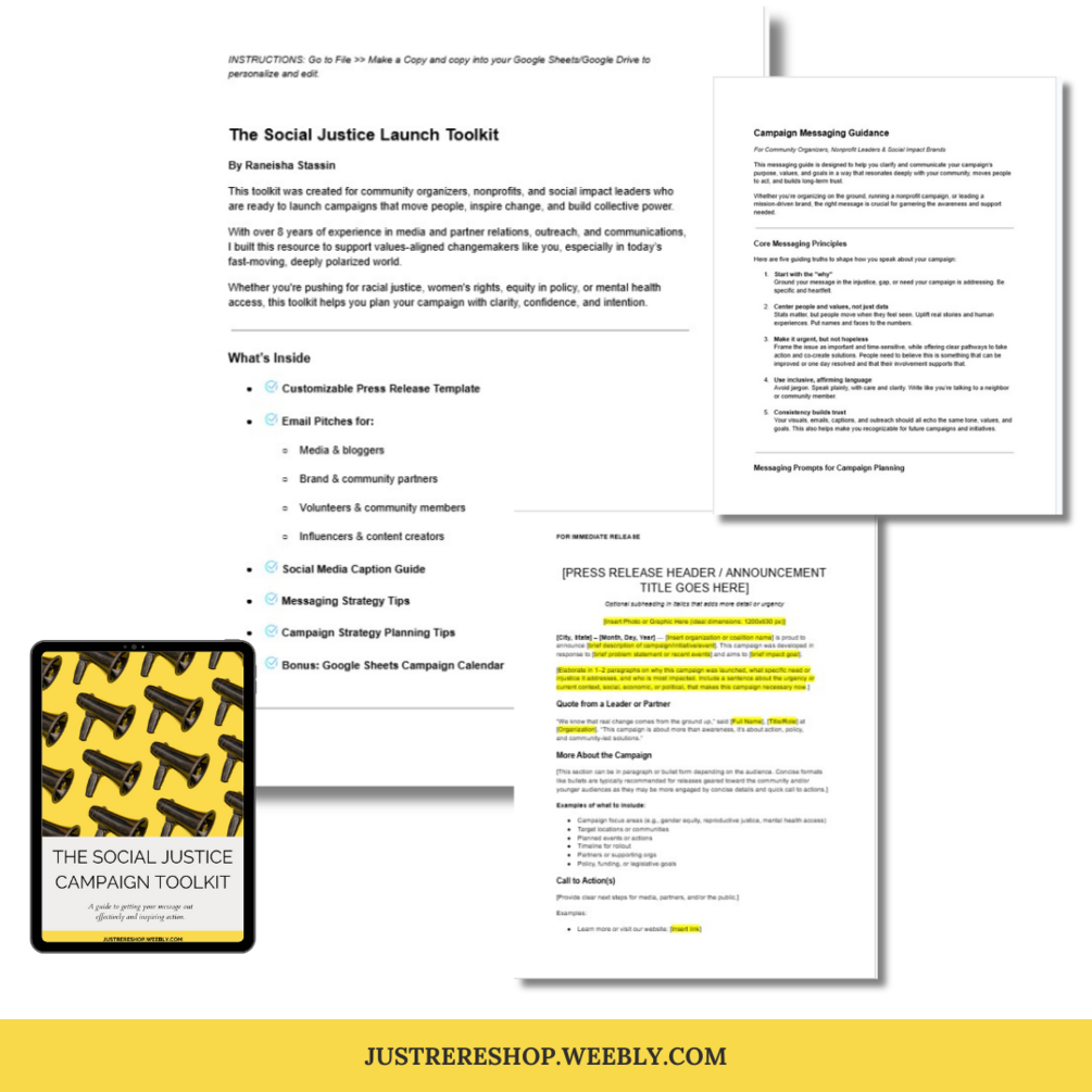 Whether you’re launching a grassroots campaign, nonprofit initiative, or mission-driven brand movement, this toolkit is your all-in-one guide to strategic, community-centered organizing. Created by a seasoned publicist and strategist, this downloadable PDF gives you access to: